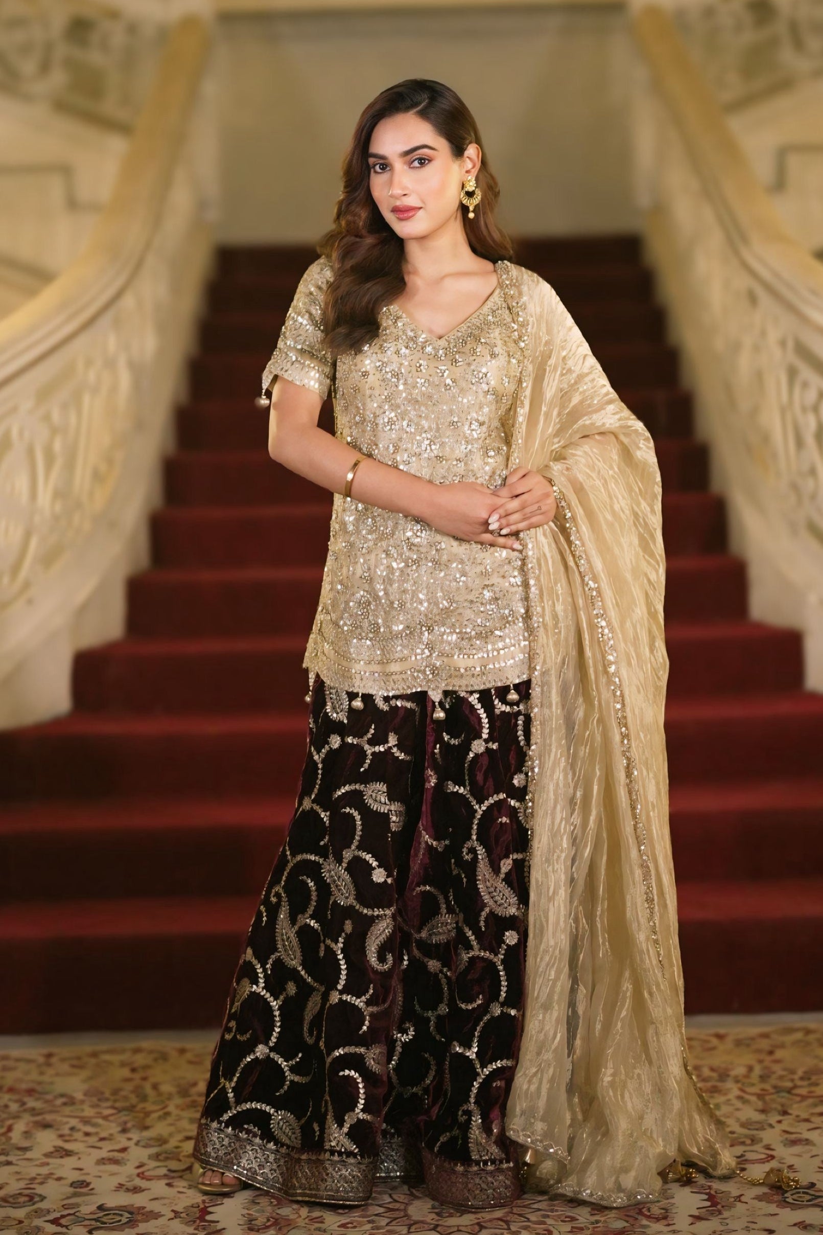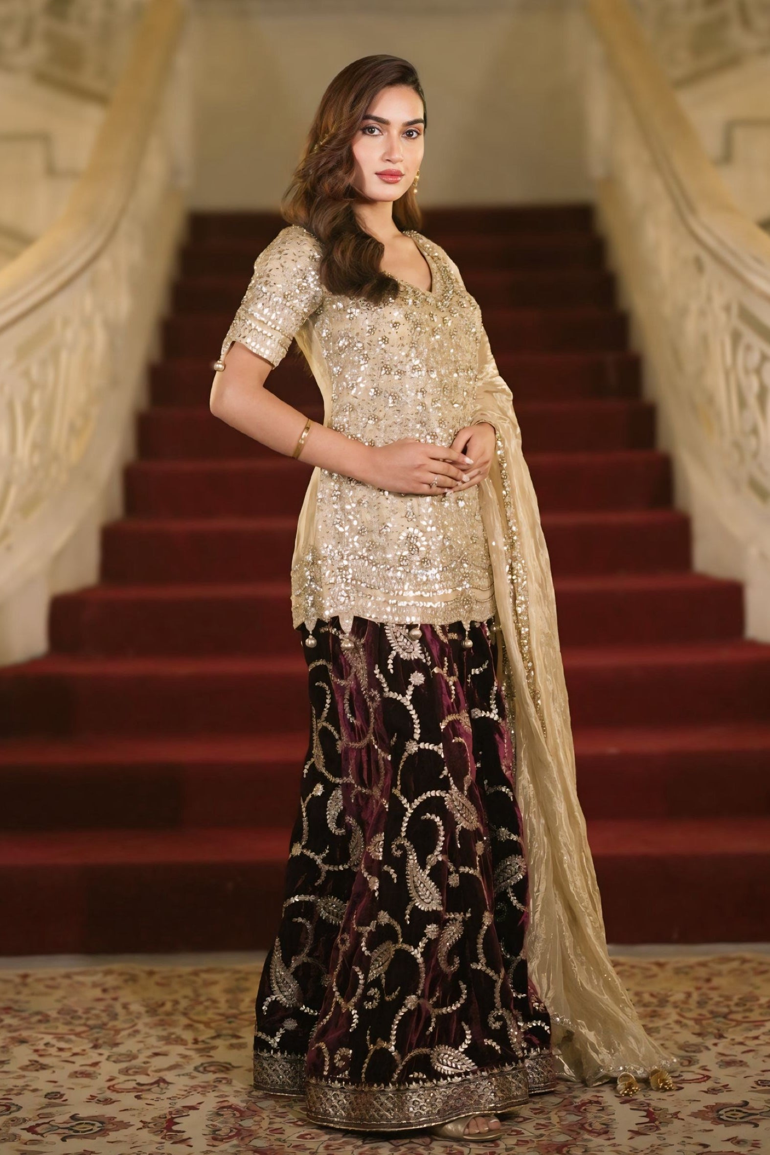Wrapped in gold, grounded in grace. This sharara set celebrates handcrafted beauty, feminine strength, and timeless silhouettes.