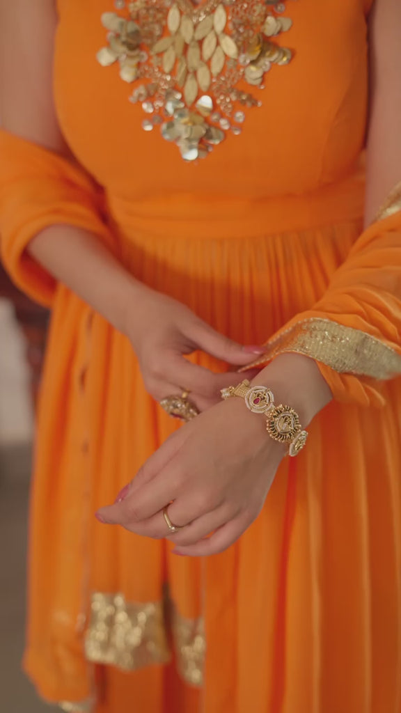This gorgeous designer suit is crafted in georgette and embellished with mirror work, cut-dana, petal sequins, and gotta. It is paired with a satin salwar and a flowy dupatta, the ensemble blends traditional handwork with a chic modern cut.