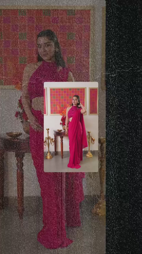 This beautiful magenta ready to wear saree is crafted in soft lycra fabric paired with gorgeous halter neck blouse having intricate 3d floral work.