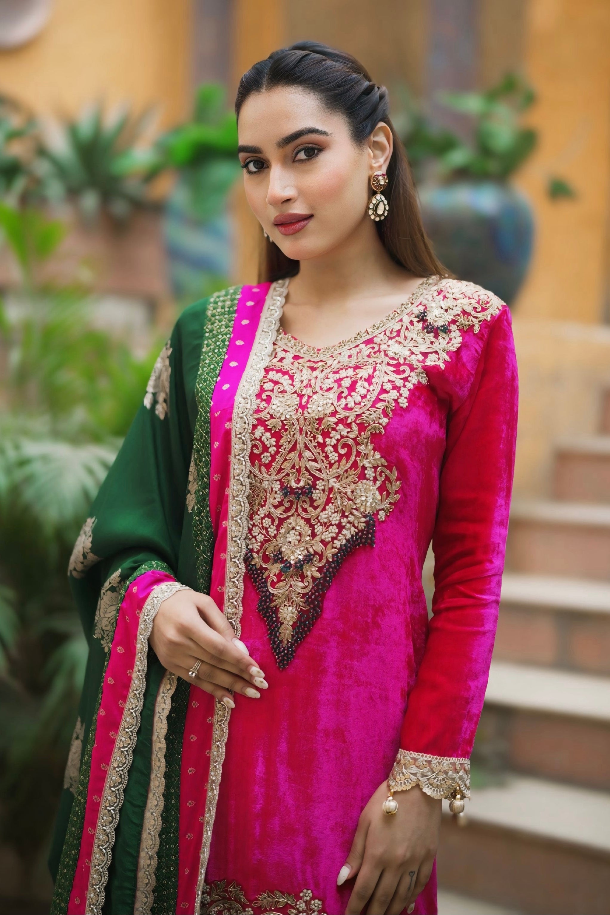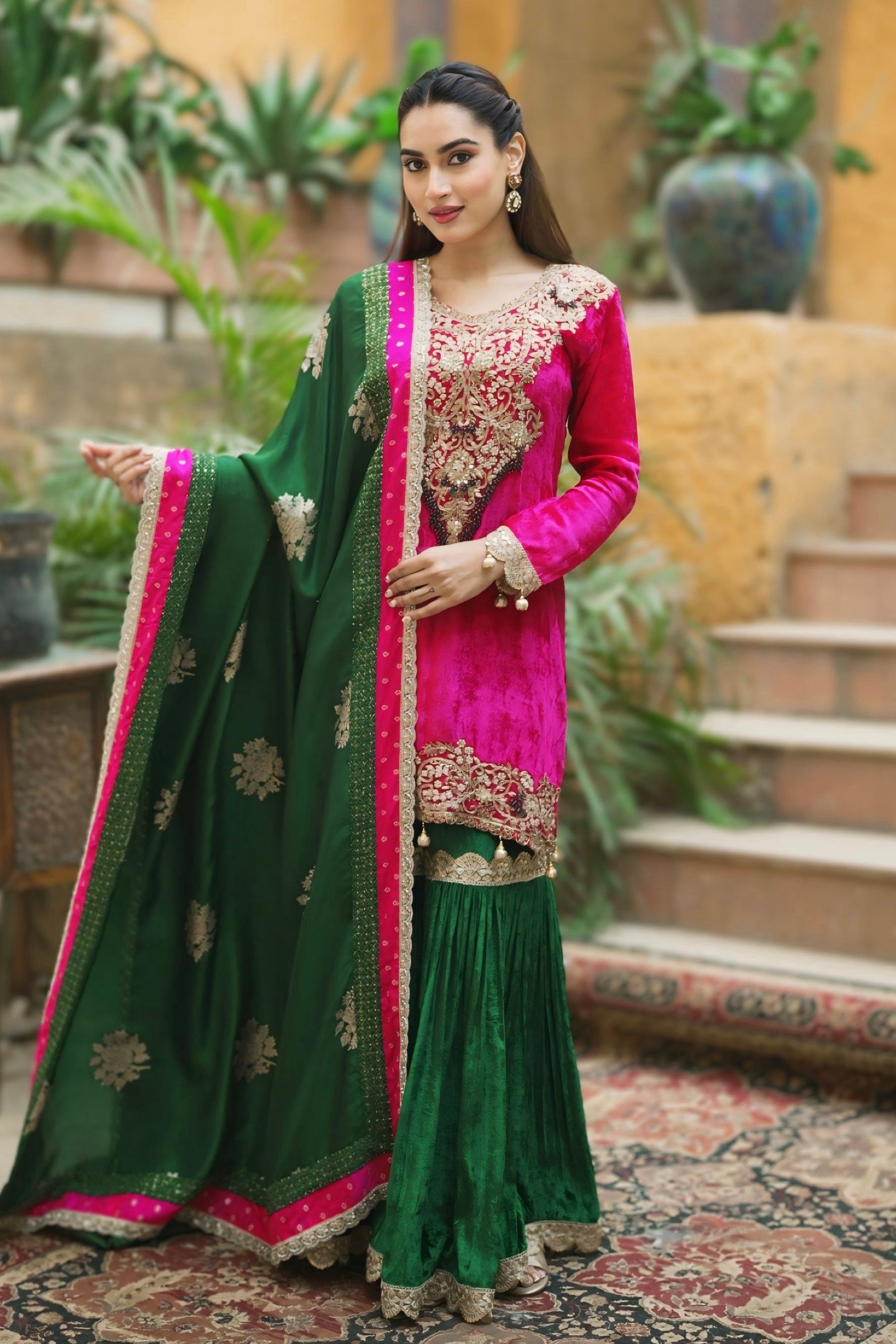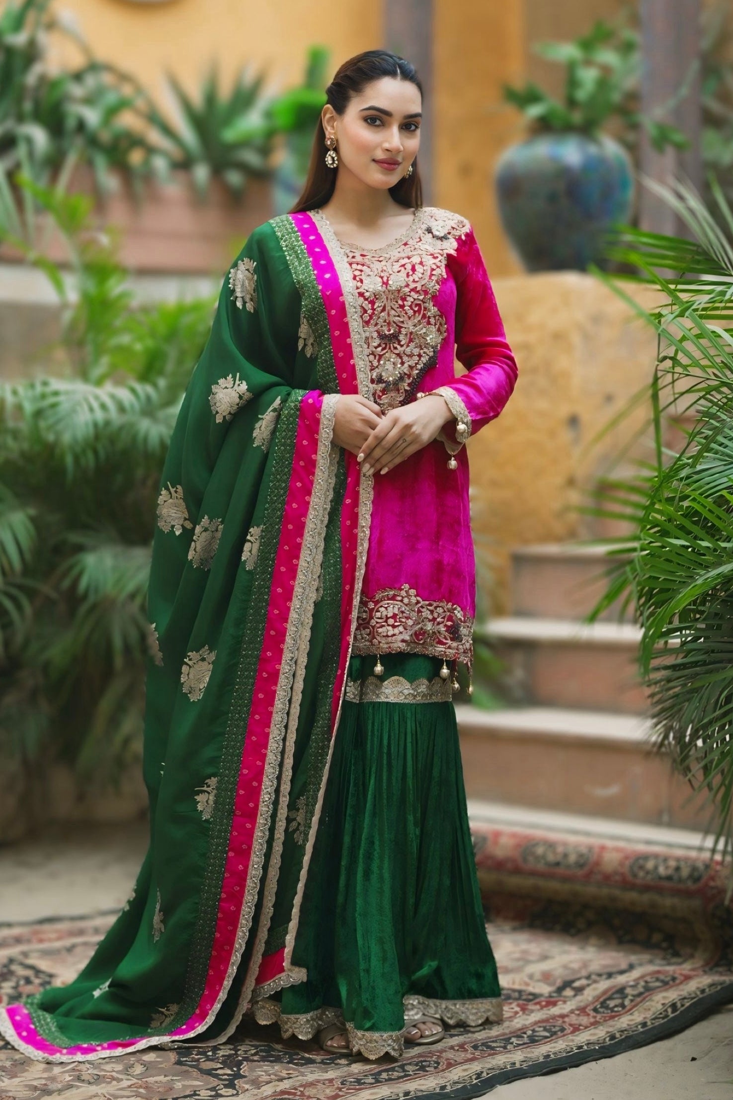 This pink & green sharara set is crafted with rich velvet, intricate hand embroidery, and a graceful drape that moves like poetry.