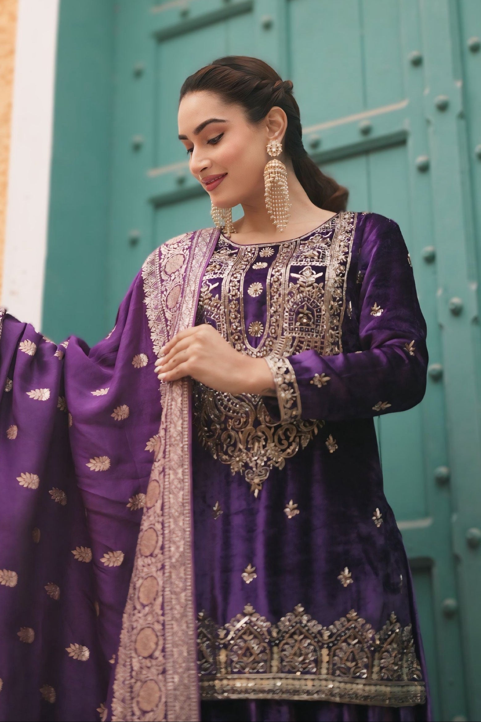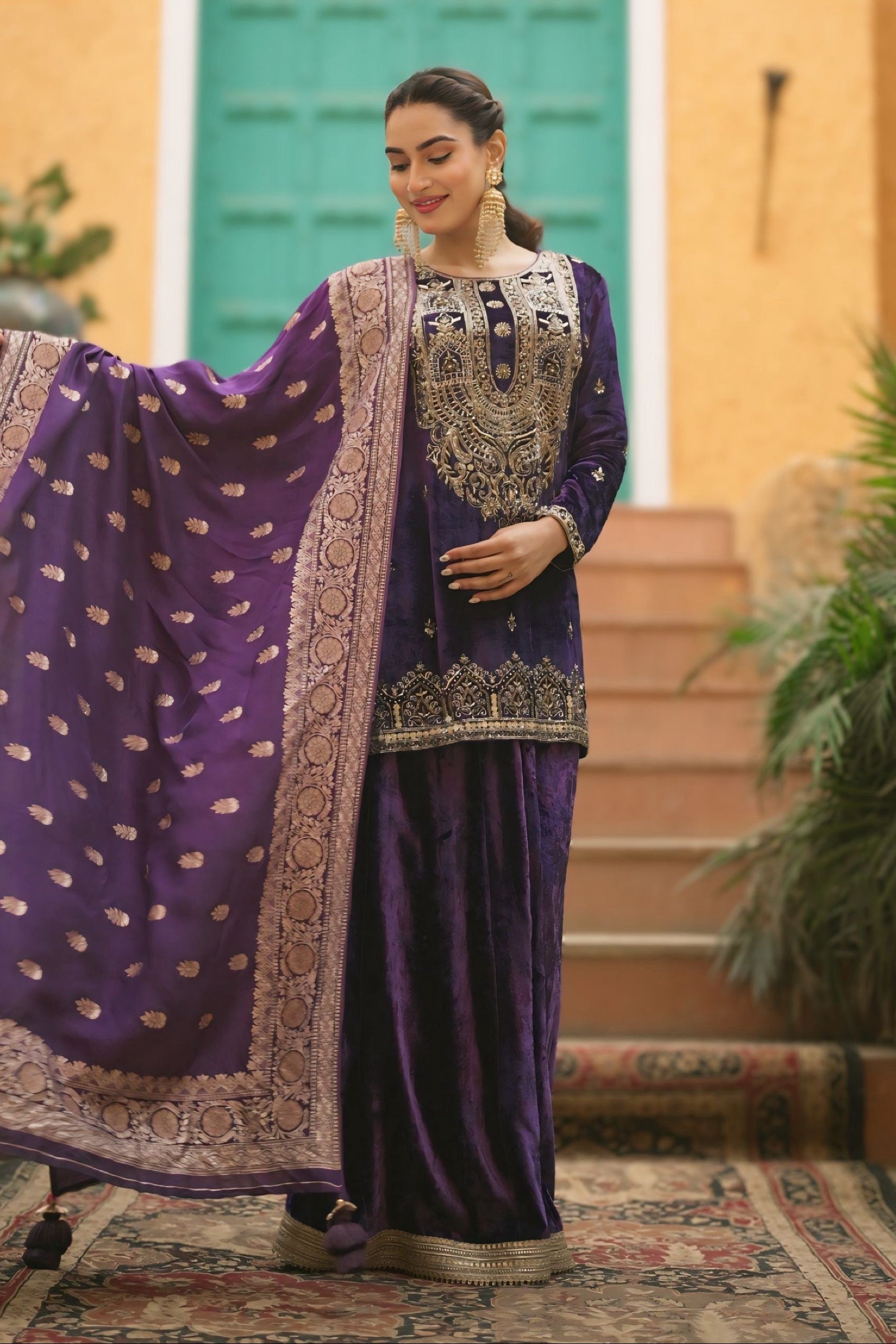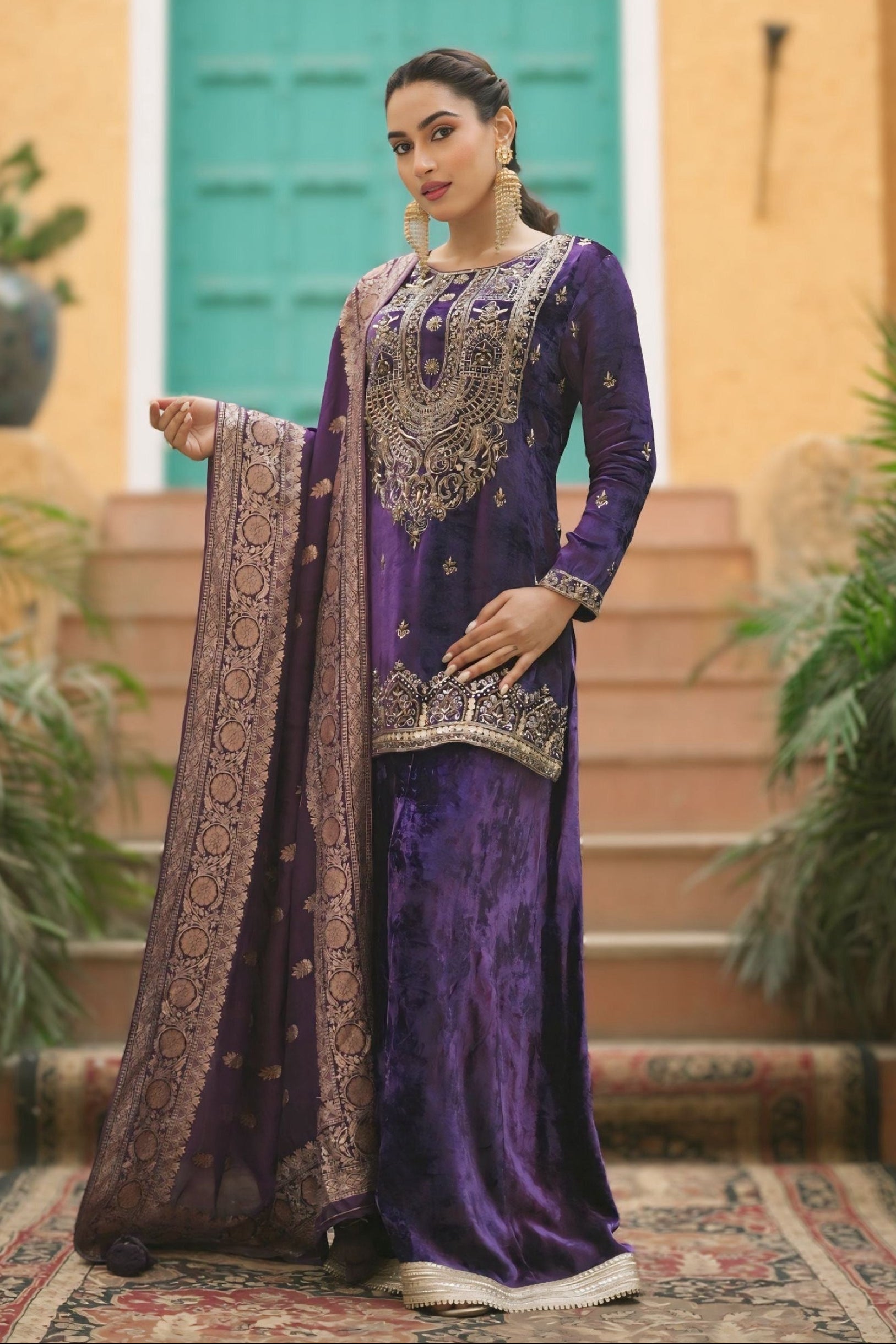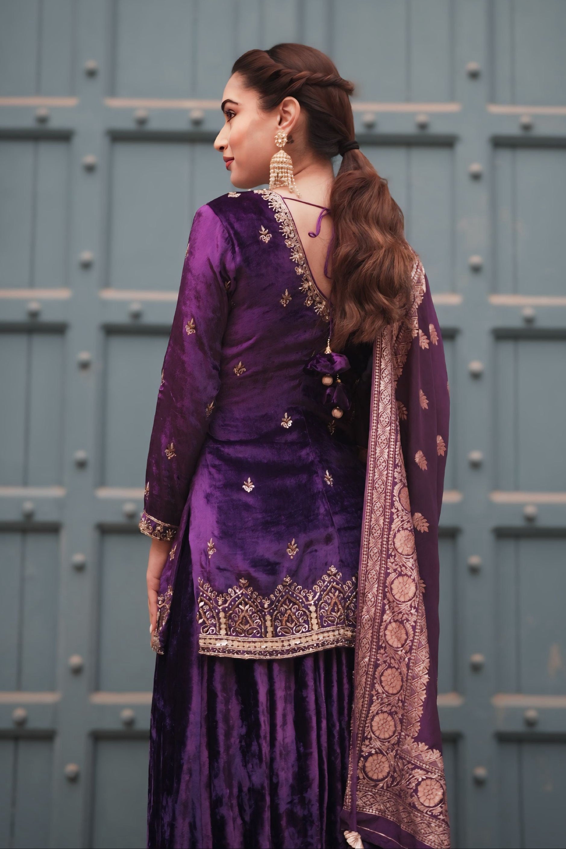 A designer velvet sharara by Aliyana, created as a conceptual ensemble rather than a seasonal statement. The intricate hand embroidery, balanced proportions, and controlled volume make it a refined choice for weddings, curated celebrations, and private soirées.