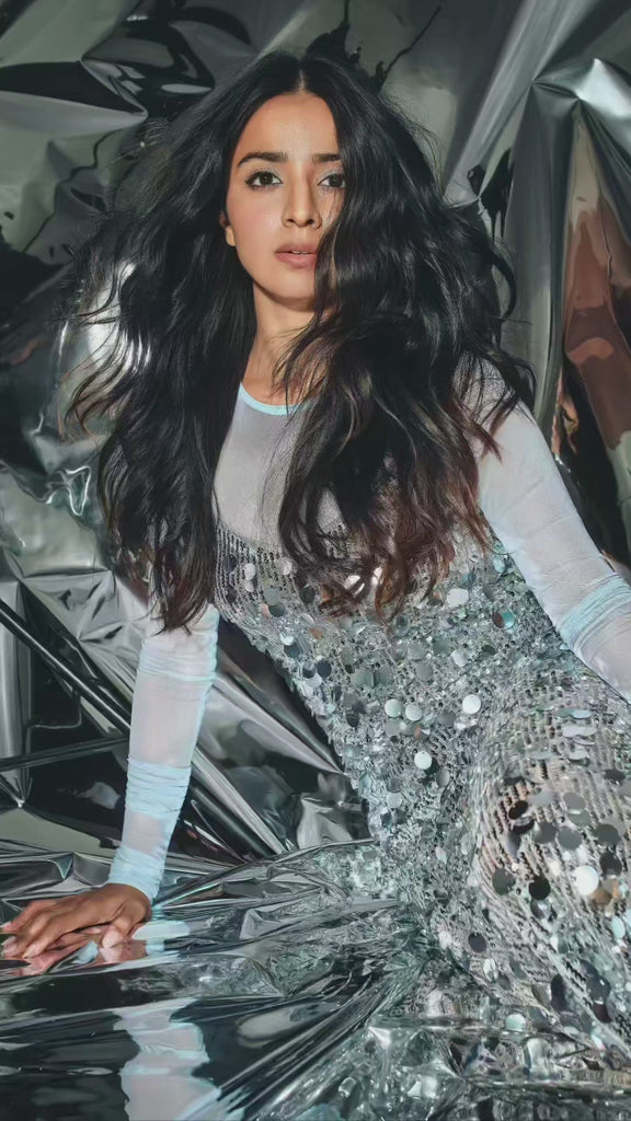 Drenched in silver sequins and layered with soft whispers of sheer, this look is made for moments where you refuse to blend in.