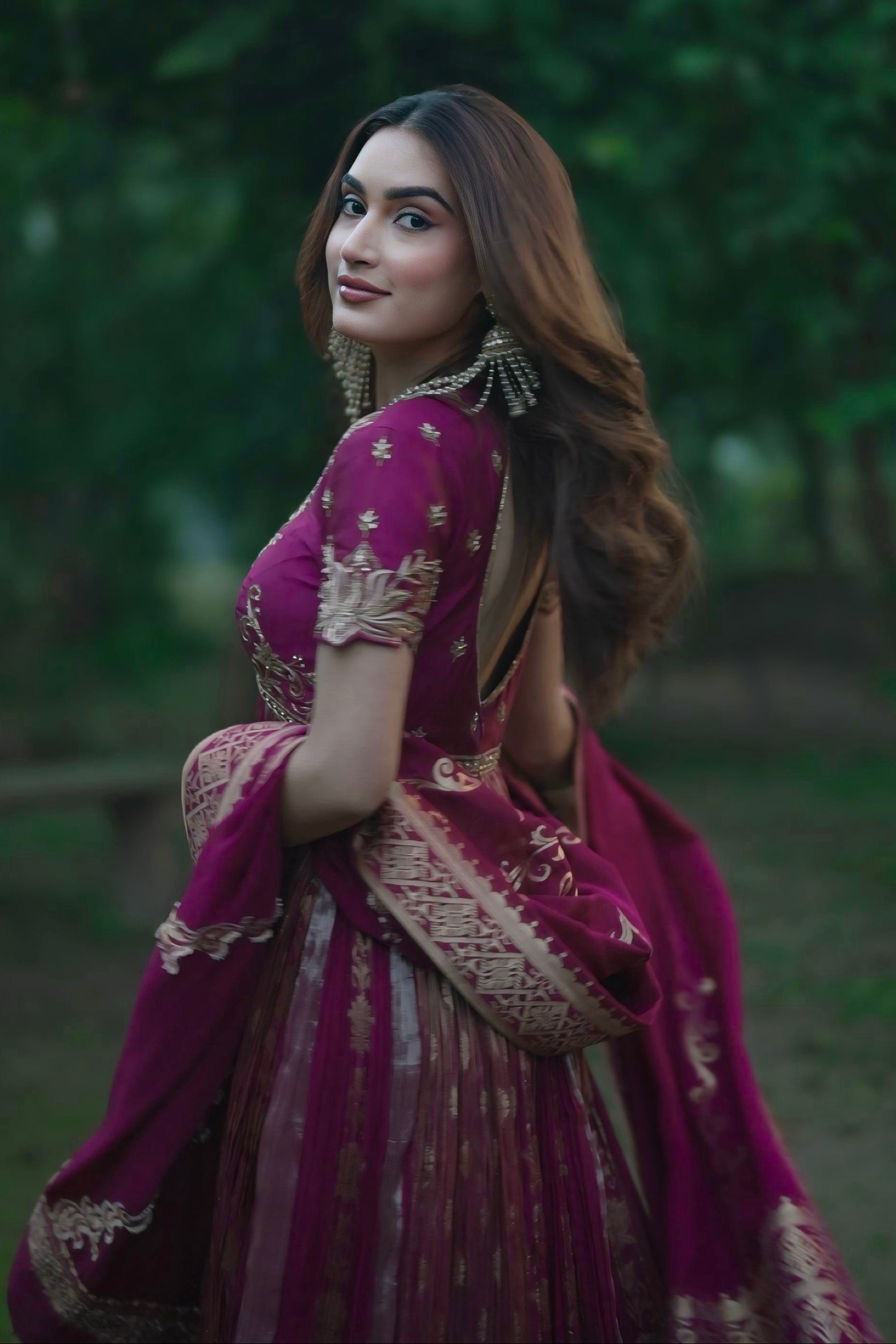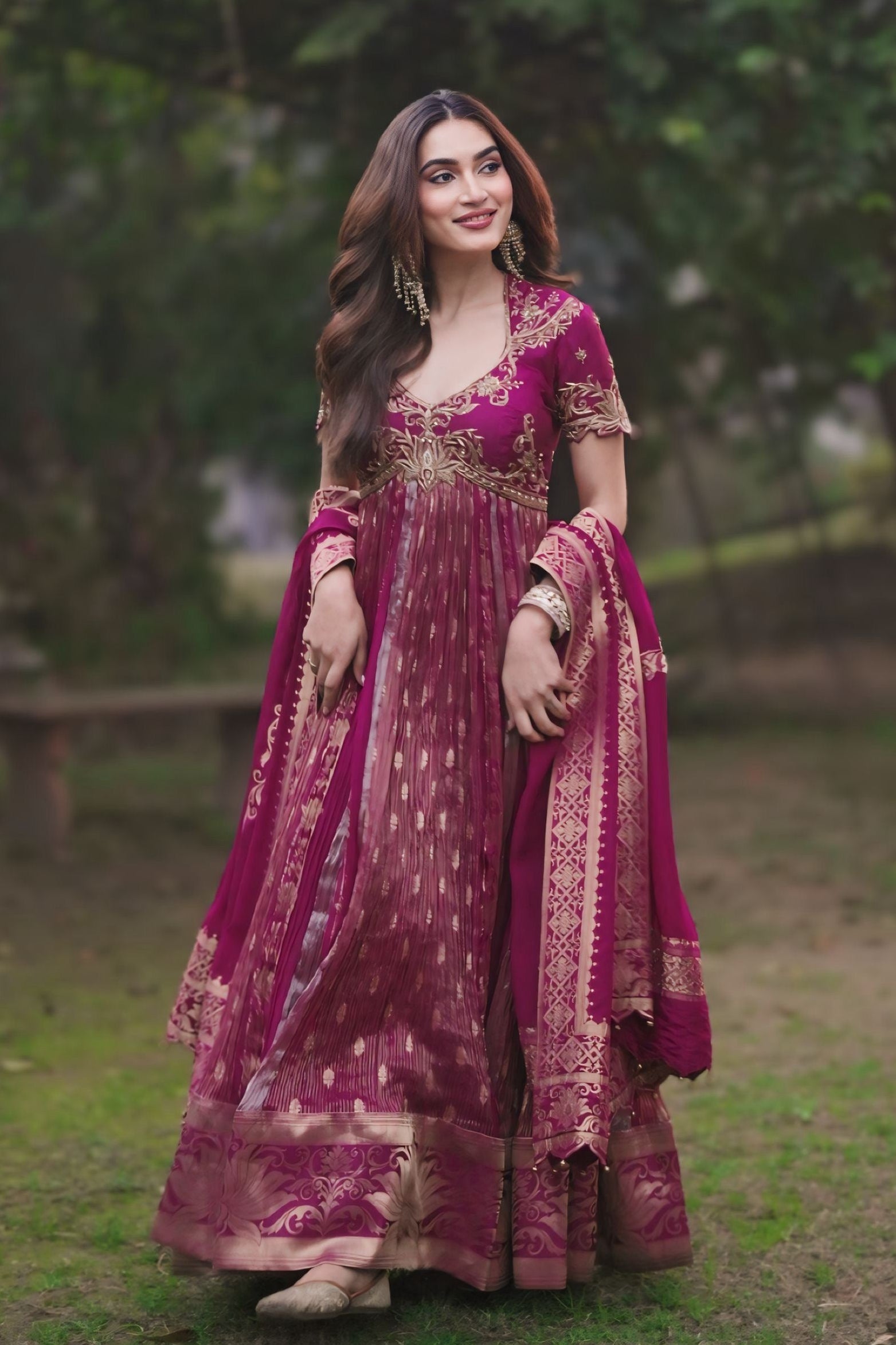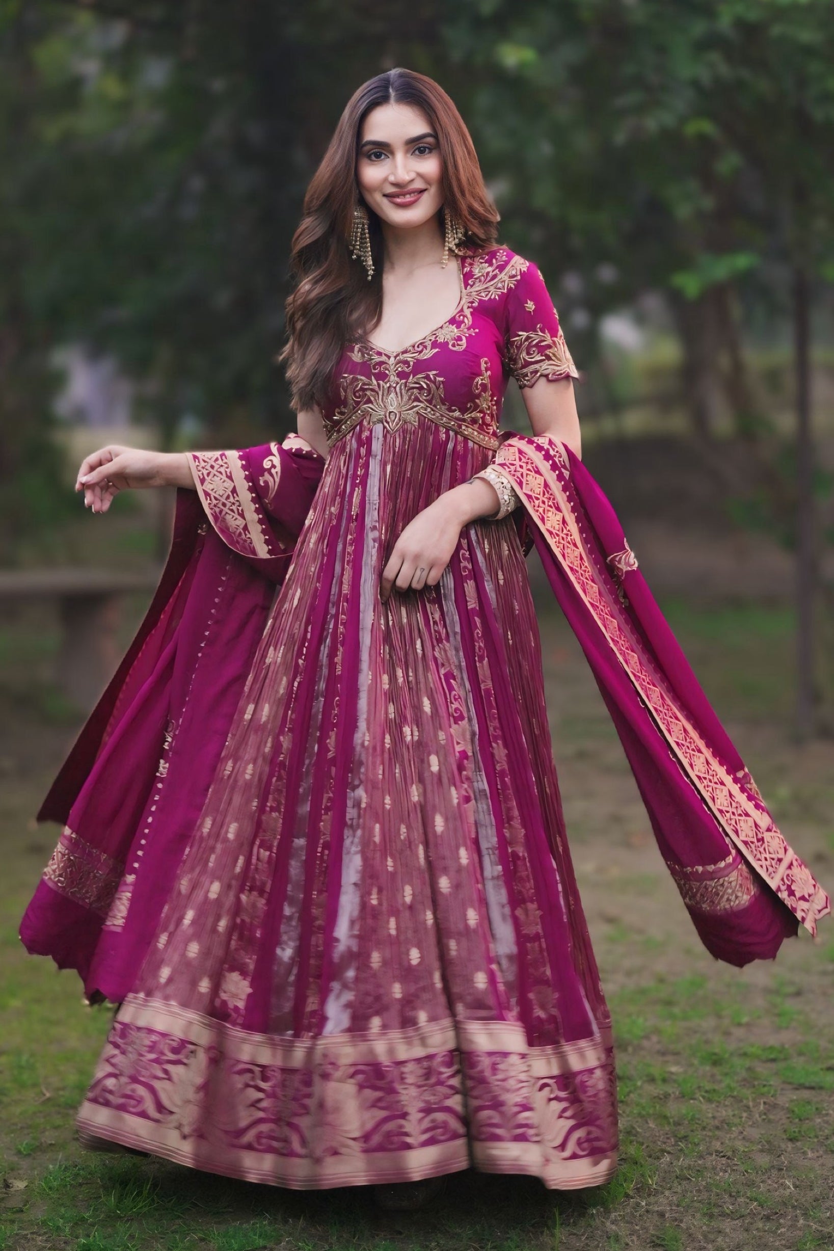 This Banarasi silk hand-embroidered Anarkali suit by Aliyana is designed to celebrate femininity and flow. The luxurious silk drapes softly, while fine hand embroidery highlights the craftsmanship in every detail. The result is a silhouette that feels rich yet effortless, perfect for special occasions. Made for weddings, festivities, and moments where elegance feels natural and personal.